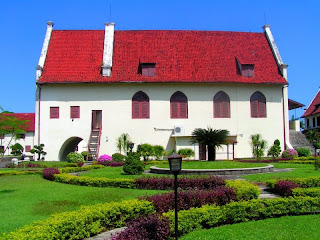 It really was a nice place to walk around, the gardens around the buildings were nicely laid out with palm trees and pink flowers, the Dutch architectural style reminded us of Danish buildings from that period, but the baking sun, the lush palm trees and the Indonesian flag waving in the hot air above still made the place seem pretty exotic.